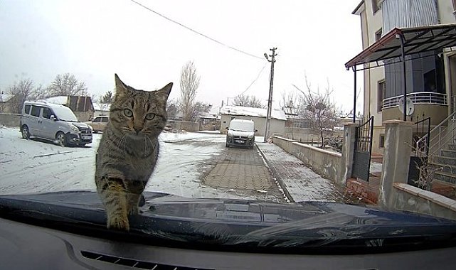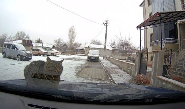 Erzincan'da bir otomobilin üzerine çıkan kedi, araç içi kamerasına yansıdı. Saniye saniye kaydedilen görüntülerde, soğuktan üşüyen kedinin aracın motor kısmından gelen sıcaklıkla ısındığı görüldü.