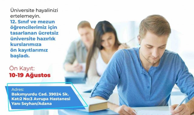 Gençlere bu fırsatı kaçırmamaları çağrısında bulunan Tekin, üniversite hazırlık kurslarından faydalanmak isteyen Seyhanlı öğrencilerin, 19 Ağustos Pazartesi gününe kadar Bakımyurdu Cad. 39024 Sk. Kat:2. No:3 adresinde bulunan kurs merkezine giderek ön kayıt başvurusunu yaptırmaları gerektiğini sözlerine ekledi.