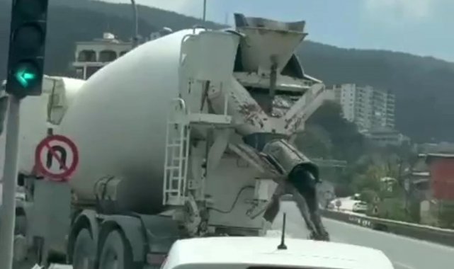 Hatay'da seyir halinde olan mikser dönüş esnasında yola beton döktü. Mikserin arkasında seyreden otomobilin üzerine beton dökülmekten saniyelerle kurtulduğu anlar cep telefonu kamerasına yansıdı.