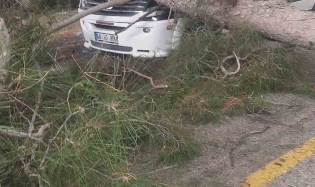 Seyir halindeki minibüsün üstüne ağaç devrildi