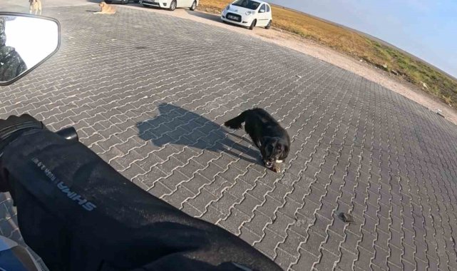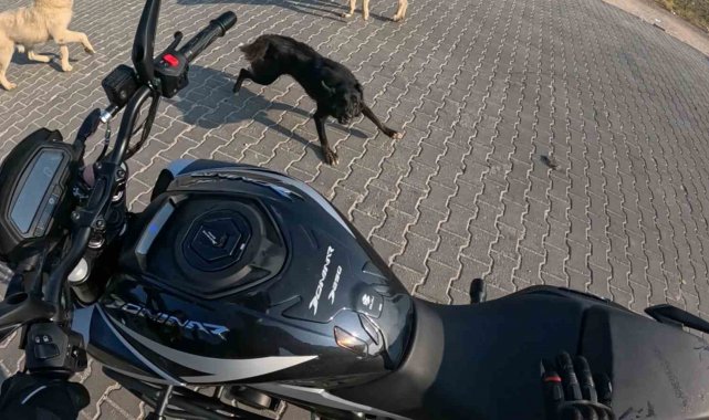 Eskişehir'de seyir halindeki motosiklete 3 başıboş köpeğin saldırı anı kask kamerasına saniye saniye yansırken, ısırılmaktan korkan sürücü aşağı inip aracını eliyle yürüterek olay bölgesinden uzaklaştı.