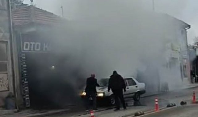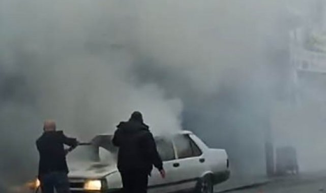 Seyir halindeki otomobil yandı, esnaf yardıma koştu