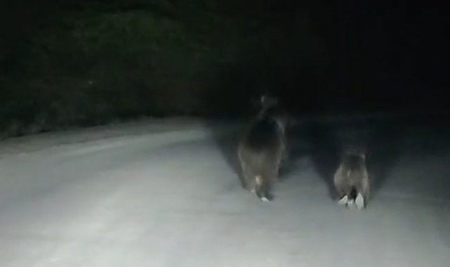 Bartın'ın Ulus ilçesi Ulukaya Kadıköyü grup yolu üzerinde otomobil ile seyir halinde bulunan bir vatandaş, yolda bulunan bir ayı ve yavrusunu gördü. Ayı ve yavrusu otomobilin ışıklarını görünce hızla kaçmaya başladı. Ayıları gören vatandaş ise cep telefonu kamerası ile o anları görüntüledi. Ayılar bir süre sonra ormana girerek gözden kayboldu.