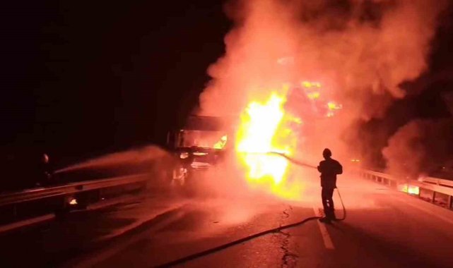 Yangın, gece saatlerinde Erzin Organize Sanayi Bölgesi'nde yaşandı. Seyir halindeki tır alevlere teslim olarak yanmaya başladı. Kısa sürede alevlerin yükseldiği tıra itfaiye ekipleri müdahale etti. Ekiplerin müdahalesiyle kontrol altına alınan alevler, dorse kısmına sirayet etmeden söndürüldü. Yangında can kaybı ve yaralanma yaşanmazken tır kullanılmaz hale geldi.
