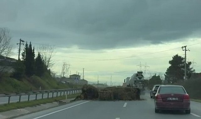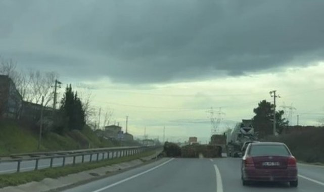 Sakarya'nın Adapazarı ilçesi D020 kara yolunda seyir halindeki tırdan düşen saman balyaları trafiği tehlikeye attı. Yola dökülen saman balyaları cep telefonu kamerasıyla görüntülendi.
