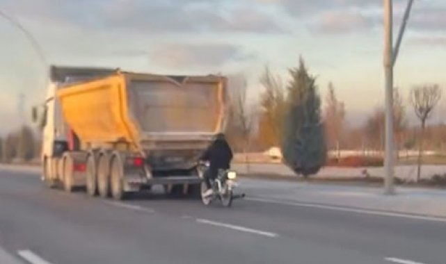 Olay, merkez Selçuklu ilçesi Büyükkayacık Mahallesi Ankara Caddesi üzerinde meydana geldi. Edinilen bilgiye göre, şehir merkezinden Ankara istikametine seyir halinde olan hafriyat taşıyan tırı peşinden bir motosiklet sürücüsü takip etmeye başladı. Zaman zaman tırın dorsesinin tamponuna yaklaşan motosiklet sürücüsü yürekleri ağza getirdi. O anlar ise başka bir araçta bulunanlar tarafından cep telefonu kamerası ile saniye saniye görüntülendi. Görüntülerde, seyir halinde olan tırın peşinde hızla seyreden motosiklet görülüyor.