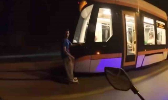 Eskişehir'de seyir halindeki tramvaya tutunan erkek şahısın paten kaydığı anlar, bir motosiklet sürücüsünün kask kamerasına yansıdı. Tehlikeli yolculuk esnasında motosiklet sürücüsünün "Dikkat et" uyarısına dikkate alamayan şahsın "Zevkli oluyor" diyerek cevap vermesi şaşırttı.