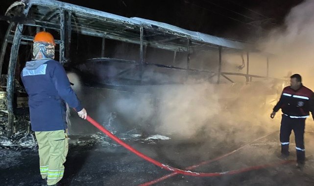 Kastamonu'da alev alev yanan yolcu otobüsünden geriye demir yığını kaldı.