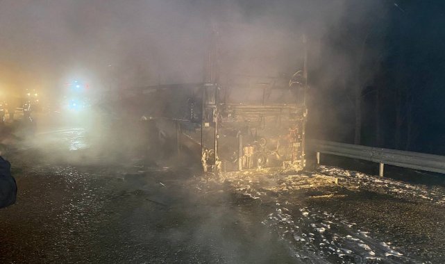 Seyir halindeki yolcu otobüsü alev alev yandı