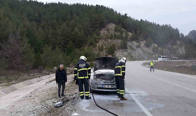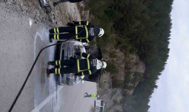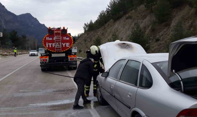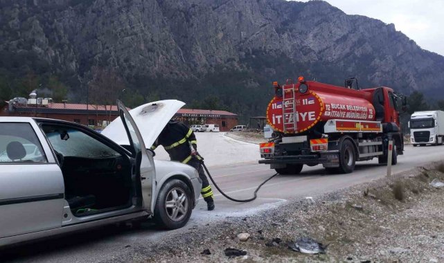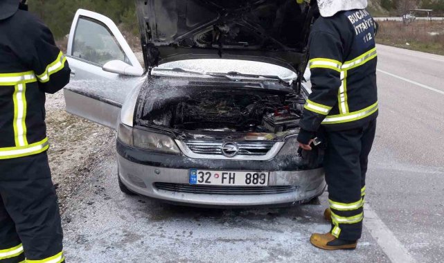 Burdur'un Bucak ilçesi Antalya-Isparta karayolu üzerinde seyir halindeyken alev alan ve motor kısmı yanarak büyük hasar gören otomobil itfaiye ekipleri tarafından söndürüldü.