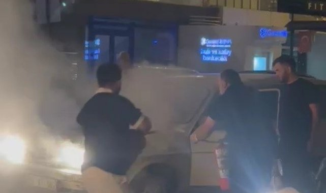 Seyir halindeyken alev alan otomobilin yardımına vatandaşlar yetişti