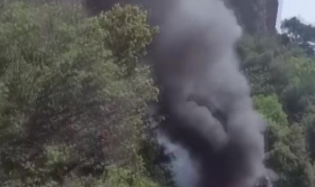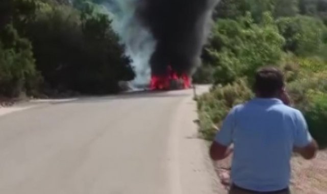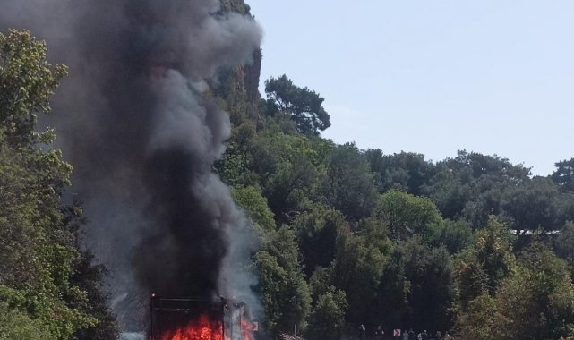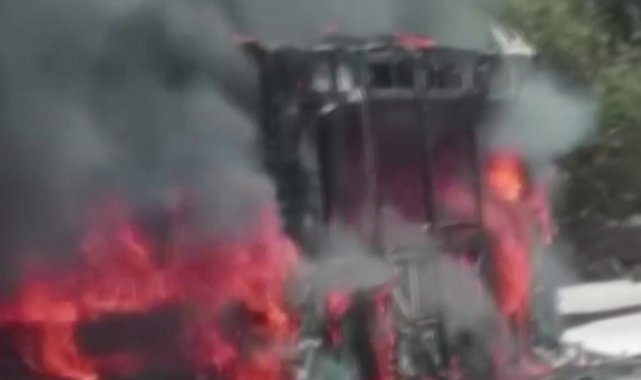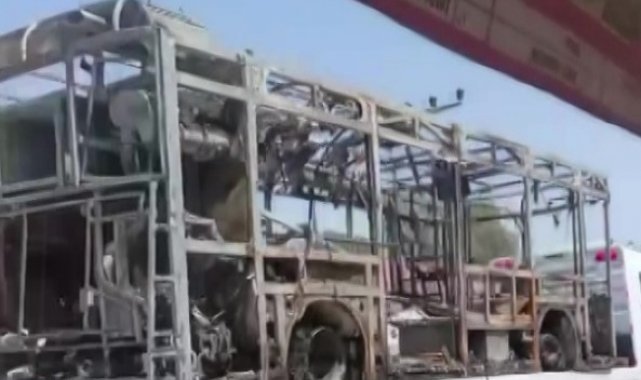 Seyir halindeyken alev alev yanan halk otobüsünden geriye demir yığını kaldı