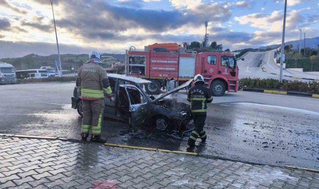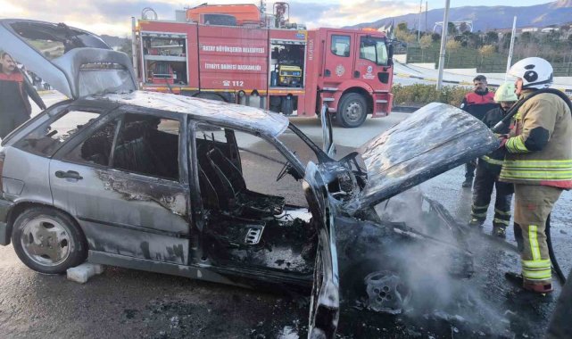 Hatay'da seyir halindeyken alevlere teslim olan TOFAŞ marka otomobil, yanarak kullanılamaz hale geldi.