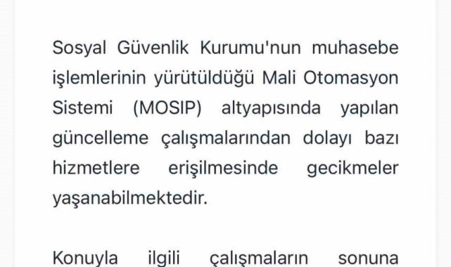 Sosyal Güvenlik Kurumu'nun muhasebe işlemlerinin yürütüldüğü Mali Otomasyon Sistemi (MOSİP) altyapısında yapılan güncelleme çalışmalarından dolayı bazı hizmet ekranlarına erişim sağlanamıyor.