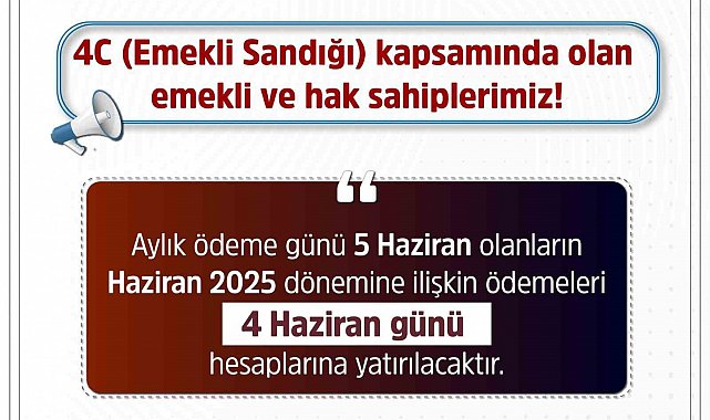 SGK, sosyal medya hesabından emekli aylık ödemelerine ilişkin bir açıklama yayımladı. Açıklamada, "Aylık ödeme günü 5 Haziran olan 4C (Emekli Sandığı) kapsamındaki emekli ve hak sahiplerimizin Haziran 2025 dönemine ilişkin aylık ödemeleri öne çekilerek 4 Haziran 2025 tarihinde hesaplara yatırılacaktır" ifadelerine yer verildi.