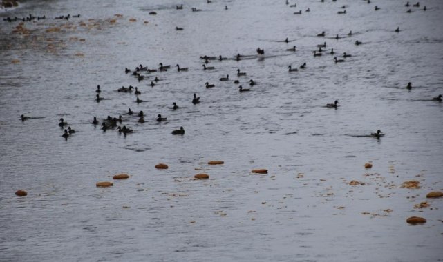 Sibirya ve Rusya'dan göç eden yeşilbaşlı ördekler, kış aylarında Bayburt'tan geçen Çoruh Nehri'ni mesken tuttu.