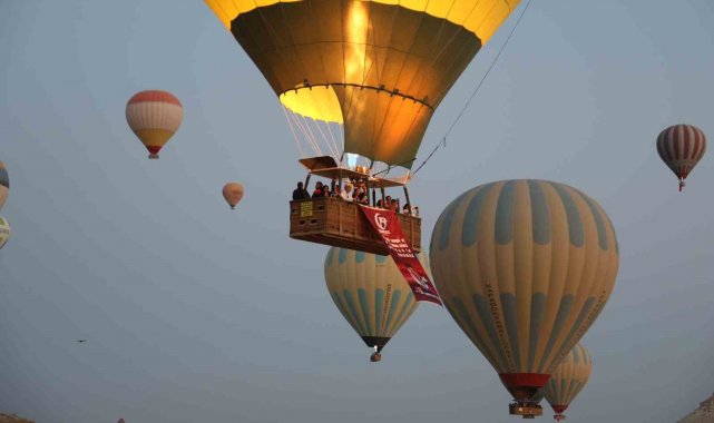 UNESCO Dünya Doğal ve Kültürel Miras Listesi'nde yer alan Kapadokya bölgesinde sıcak hava balonları, 15 Temmuz Demokrasi ve Milli Birlik Günü dolayısıyla Türk bayrağı ve pankartlarla gökyüzüne süzüldü.