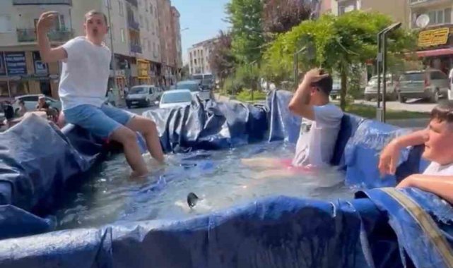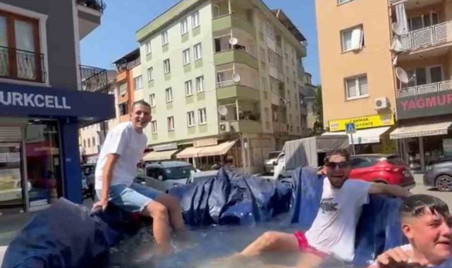 Bursa'da sıcak havalardan bunalan bir grup genç, traktörün römorkunu suyla doldurup mobil havuza çevirdi. Şehir turu atan gençler sıcak havaların tadını doyasıya çıkardılar.