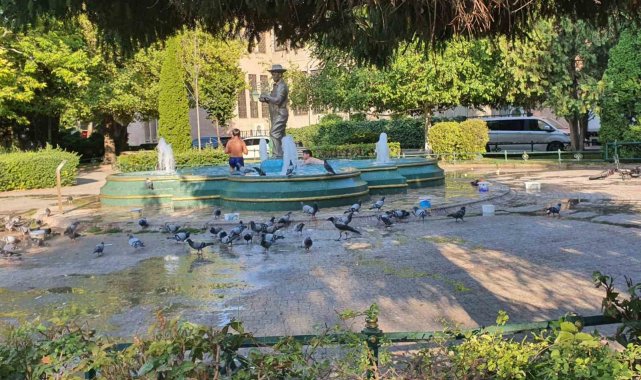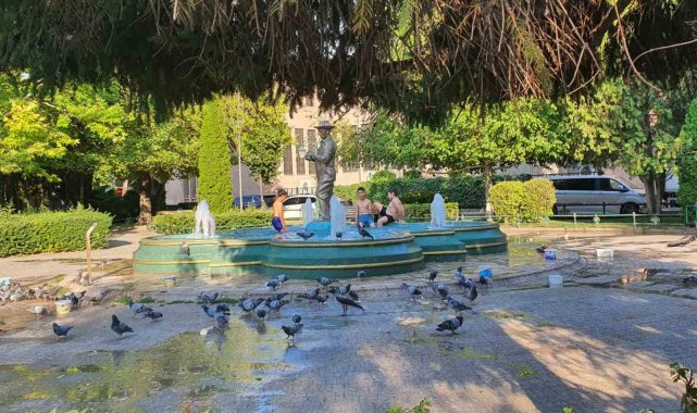Sıcaklardan bunalan çocuklar süs havuzuna girerek serinlemeye çalıştı