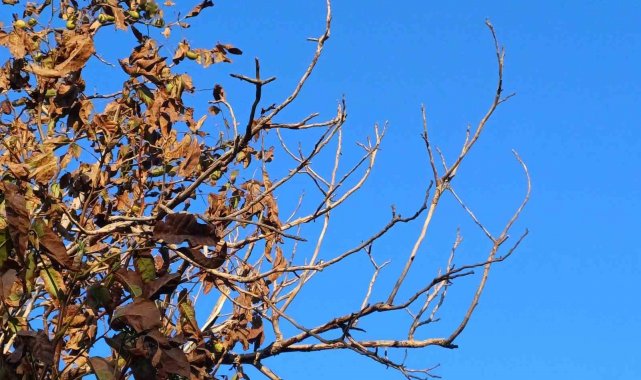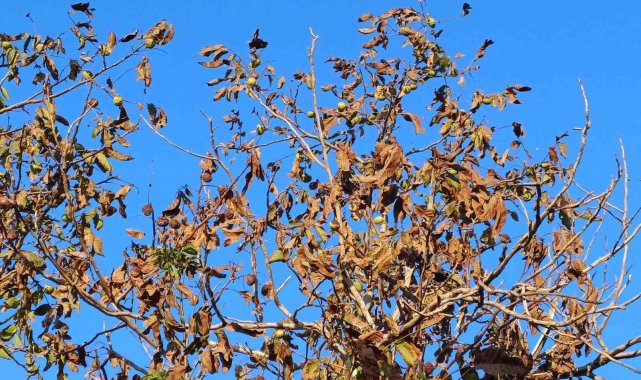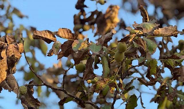 Sıcaklardan etkilenen ceviz ağaçlarının yaprakları ile meyveleri kurudu