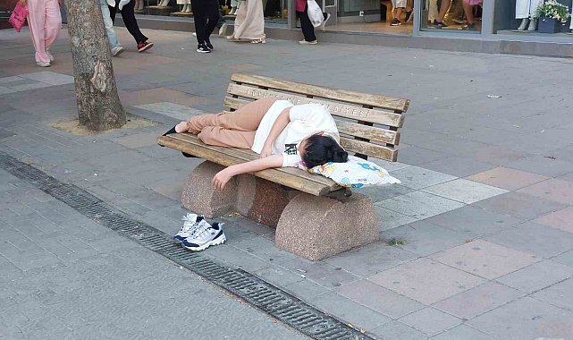 Eskişehir'de sıcaktan bunalan bir gencin şehrin en işlek caddesi üzerindeki bir bankta uzanıp uyuması ilginç bir görüntü oluşturdu.