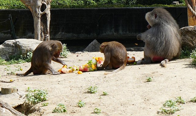 Hayvanat bahçesi çalışanları, inek, eşek, deve, at gibi hayvanları hortumlarla serinletmeye çalışırken, bazı hayvanları ise çeşitli sebze ve meyvelerden oluşan buzlu karışımla serinletmeye çalıştı. Bakıcıları tarafından özenle hazırlanan kokteyller için birbiriyle yarışan maymunlar, sıcak havada serinlemenin keyfini çıkardı.