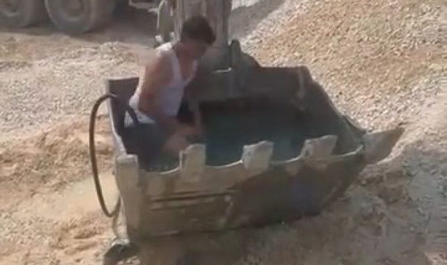 Hava sıcaklığının 40 dereceyi geçtiği Elazığ'da vatandaşlar serinlemenin yöntemlerini arıyor. Sıcaklıklardan en çok etkilenenler arasında bulunan inşaat işçileri ise serinlemek için farklı bir yol buldu. İşçiler, kepçenin küreğini su ile doldurarak havuza çevirdi. Su dolu küreğe binen işçiler serinlemenin keyfini yaşadı.
