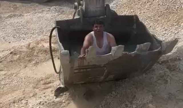Sıcaktan bunalan işçiler kepçeyi havuza çevirdi