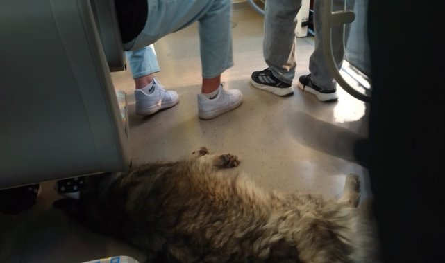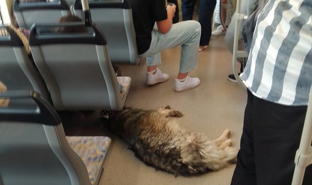 Eskişehir'de sıcak havadan bunalıp sığındığı tramvayda yere serilen köpek görenleri gülümsetti.