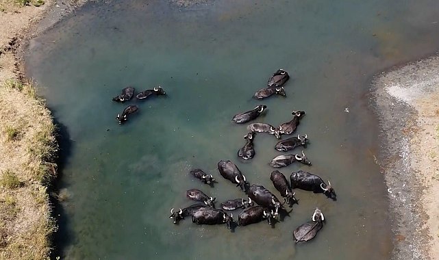 Erzincan'a birkaç kilometre uzaklıktaki Akyazı Mahallesi'nde mandaların doğal ortamında beslenmeleri sonrası dere içinde geçirdikleri keyifli dakikalar, Tanzanya'nın Serengeti Milli Parkı'nı akıllara getiriyor. Sıcaktan bunalan mandalar saatlerce sudan çıkmıyor.