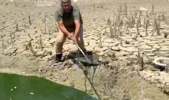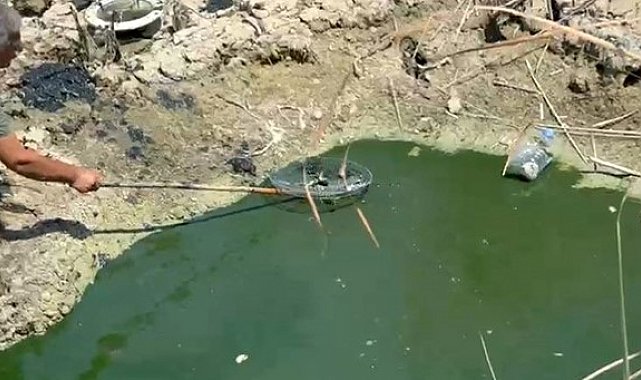 Antalya'nın Serik ilçesinde mahalle muhtarı aşırı sıcaklardan dolayı kuruyan sazlık alandaki balıkları, kendi yaptığı kafesle toplayarak telef olmaktan kurtardı.