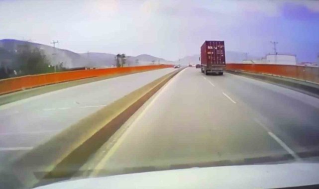 Hatay'ın İskenderun ilçesinde kuvvetli fırtına seyir halindeki tırda taşınan yük konteynerini yola uçurdu. Olayda yaralanan olmazken, konteynerin tırdan yola uçtuğu anlar araç kamerasına yansıdı.
