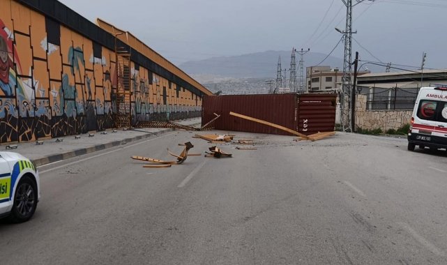 Olay; İskenderun - Payas yolu Akçay bölgesinde yaşandı. Seyir halinde ilerleyen tırın üzerinde bulunan konteyner, kuvvetli fırtınayla uçtu. Tırdan uçan konteyner, köprüden aşağı düştü ve yolu trafiğe kapattı. İhbar üzerine bölgede polis ekipleri tarafından güvenlik önlemi alındı. İskenderun İlçe Emniyet Müdürü Nevzat Güneş'de bölgeye giderek olay yerinde koordinasyonu sağladı. Öte yandan konteynerin tır üzerinden uçtuğu anlarsa seyir halindeki bir aracın kamerasına yansıdı. Konteynerin kaldırılmasıyla yol araç trafiğine yeniden açıldı.