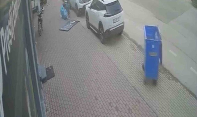 Aynı anlarda lodosun etkisiyle bir çöp kutusunun da sürüklendiği görüldü. Yaşanan tehlikeli anlar, çevredeki bir iş yerinin güvenlik kamerasına yansıdı.