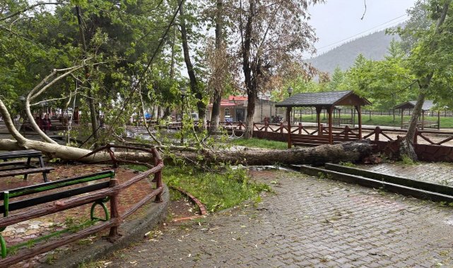 Osmaniye'de şiddetli yağmur ve fırtına nedeniyle mesire alanında bulunan tarihi çınar ağacı gövdesinden kırıldı.