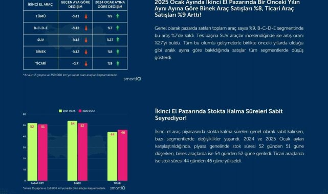 İkinci el araç piyasasında stokta kalma süreleri büyük oranda sabit kalırken, bazı segmentlerde değişiklikler yaşandı. 2024 ve 2025 Ocak ayları karşılaştırıldığında piyasa genelinde stok süresi 52 günden 51 güne düşerken, binek araçlarda ise 54 günden 52 güne geriledi. Ticari araçlarda ise stok süresi 44 günden 46 güne yükseldi.