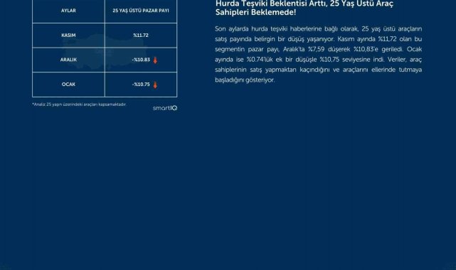 Son aylarda hurda teşviki haberlerine bağlı olarak 25 yaş üstü araçların satış payında belirgin bir düşüş yaşanıyor. Kasım ayında yüzde 11,72 olan bu segmentin pazar payı, aralıkta yüzde 7,59 düşerek yüzde 10,83 seviyesine geriledi. Ocak ayında ise yüzde 0,74'lük ek düşüşle yüzde 10,75 seviyesine indi. Veriler, araç sahiplerinin satış yapmaktan kaçındığını ve araçlarını ellerinde tutmaya başladığını gösteriyor.
