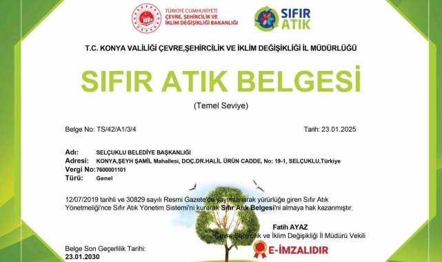Çevre, Şehircilik ve İklim Değişikliği Bakanlığı tarafından yürütülen Sıfır Atık Projesi kapsamında bugüne kadar örnek çalışmalara imza atan Konya'nın merkez Selçuklu İlçe Belediyesi, Türkiye'de ilk Sıfır Atık Belgesi yenilenen belediye oldu.