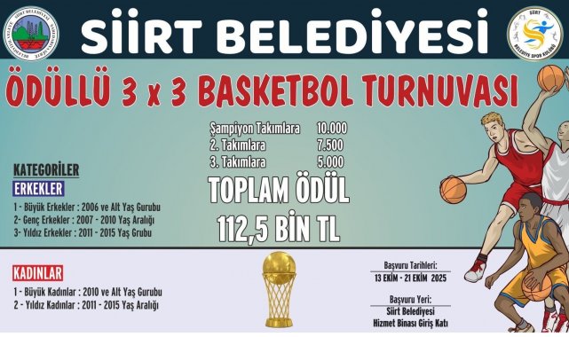 Siirt Belediyesi Spor İşleri Müdürlüğü ve Belediye Spor Kulübü iş birliğiyle organize edilen turnuva, 22 - 26 Ekim 2025 tarihleri arasında Kızlar Tepesi Şahin Bey Parkı basketbol sahalarında gerçekleştirilecek turnuvada, büyük erkekler, genç erkekler, yıldız erkekler, büyük bayanlar ve yıldız bayanlar olmak üzere 5 farklı kategoride mücadeleler yapılacak. Turnuvada dereceye giren takımlara toplam 112 bin 500 lira ödülün yanı sıra kupa ve çeşitli hediyeler verilecek. Her kategoride 1'inci takım 10 bin lira, 2'nci takıma 7 bin 500 lira, 3'üncü takıma ise 5 bin lira ödül takdim edilecek.