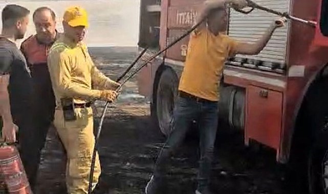 Siirt'te anız yangınına müdahale eden itfaiye aracı alevlere teslim oldu