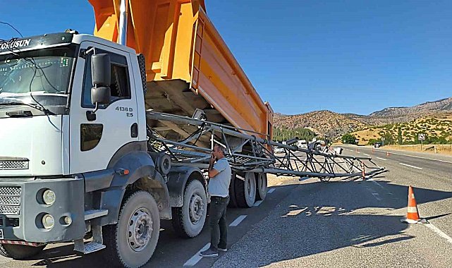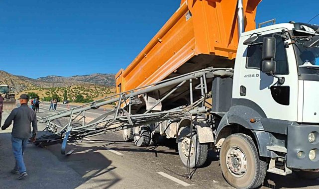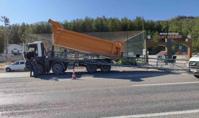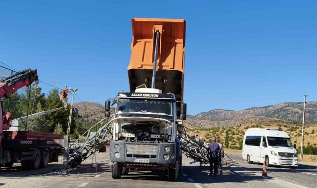 Siirt'in Baykan ilçesinde damperi açık unutulan hafriyat kamyonu, seyir halindeyken Elektronik Denetleme Sistemi (EDS) direklerine çarptı.