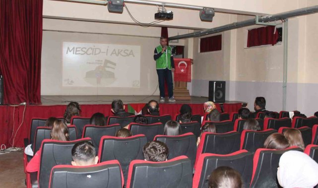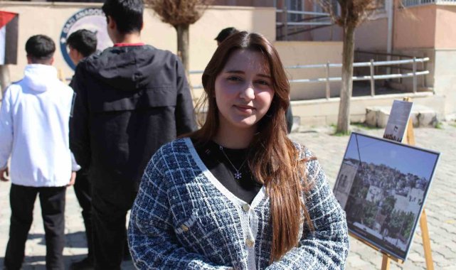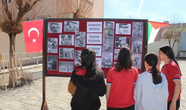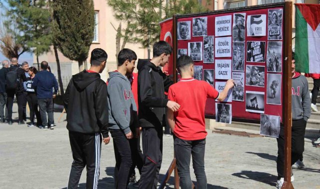Müdür yardımcısı Sabahattin Harman ise, "Bugün okulumuzda Filistin'le ilgili bir resim sergisi ve söyleşi yaptık. Buradaki amacımız Filistin'de yaşanan zulme dikkat çekmektir. Unutulmasını engellemek, gündemde kalmasını sağlamaktır. Küçük de olsa bu zulme biz de bir ses olalım dedik" diye konuştu.