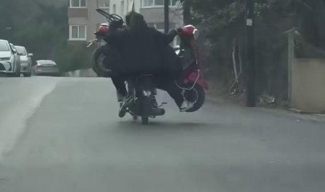 Şile'de motosikletle seyir halinde olan 2 kişi, bindikleri motosikletin üzerine başka bir motosiklet yükleyerek yolculuk yaptı. Kask takmadığı görülen şahısların tehlikeli yolcukları seyir halinde olan başka bir araç sürücüsünün kamerasına yansıdı. Videoyu çeken vatandaşlar gördükleri manzara karşısında kahkahalarını tutamadı.