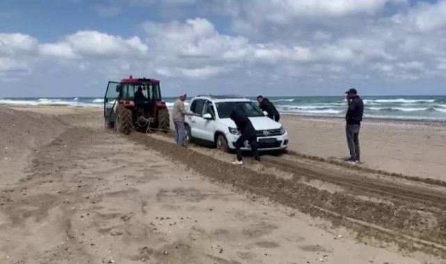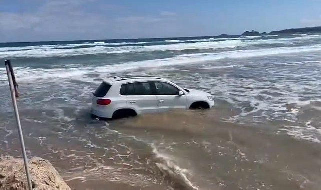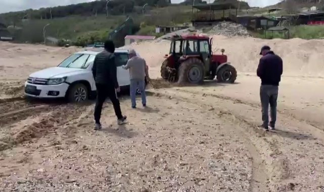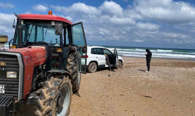 Şile Kumbaba sahilinde deniz kenarına bırakılan bir otomobil, önce kum zemine saplandı, ardından dalgaların etkisiyle denize sürüklendi. Araç, traktör yardımıyla denizden çıkarıldı.