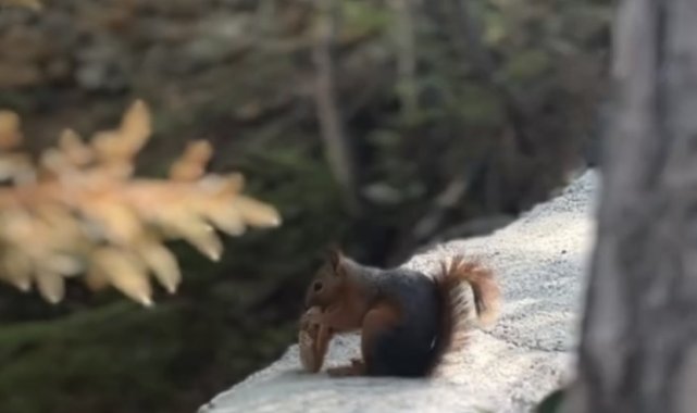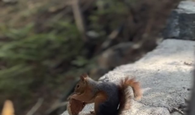 Osmaniye'nin Zorkun Yaylası'nda sincabın bayram kömbesi yerken vatandaşların cep telefonu kamerasıyla çekilen görüntüsü gülümsetti.