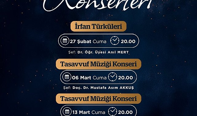 27 Şubat'taki ilk etkinlikte Şef Dr. Öğr. Üyesi Anıl Mert yönetiminde düzenlenecek konserde 'İrfan Türküleri' seslendirilecek. Ramazan'ın manevi atmosferine uygun eserlerin yer alacağı konserlerin mart ayında da devam edeceği açıklandı. 6 Mart'ta Doç. Dr. Mustafa Asım Akkuş şefliğindeki konser sanatseverlerle buluşacak. 13 Mart'ta düzenlenecek bir diğer konser Şef Prof. Dr. Mehmet Tıraşçı yönetiminde gerçekleşecek. Ramazan konserleri, Lale Konferans ve Tiyatro Salonu'nda saat 20.00'de başlayacak.