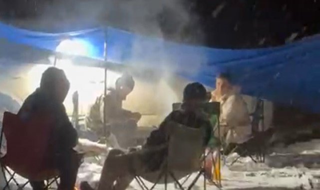 Balıkesir'in en yüksek noktalarından birisi olan Sındırgı ilçesindeki Ulus Dağı zirvesi, lapa lapa yağan kar altında misafirlerini ağırladı. Kar hasretini dindirmek isteyenler zirveye çıkarak mangal yaktı, o anları da cep telefonuyla kayıt altına aldı.