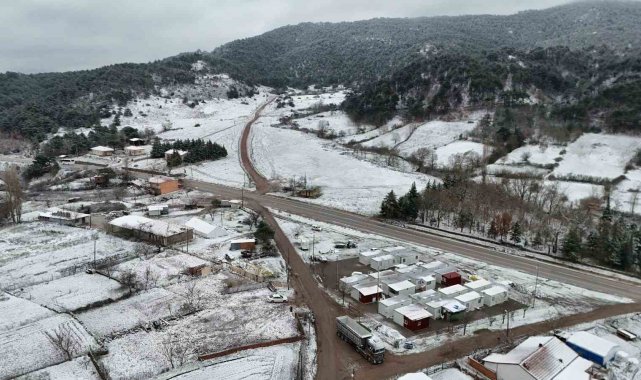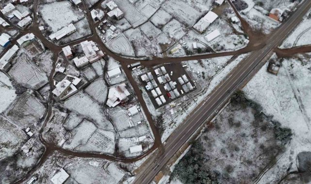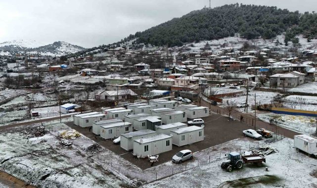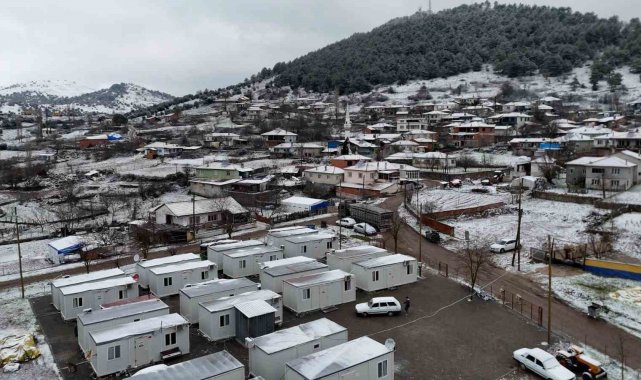 Dron ile kaydedilen görüntülerde karla kaplanan kırsal mahalle, konteyner kent alanı yer aldı.