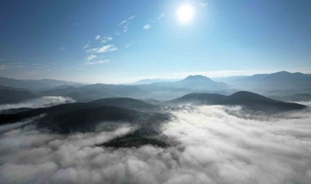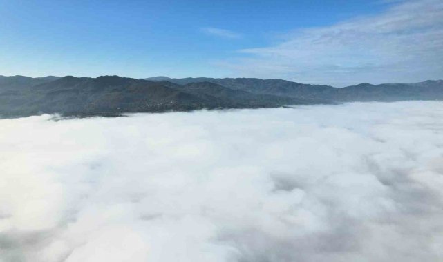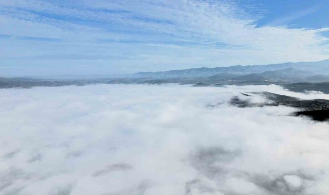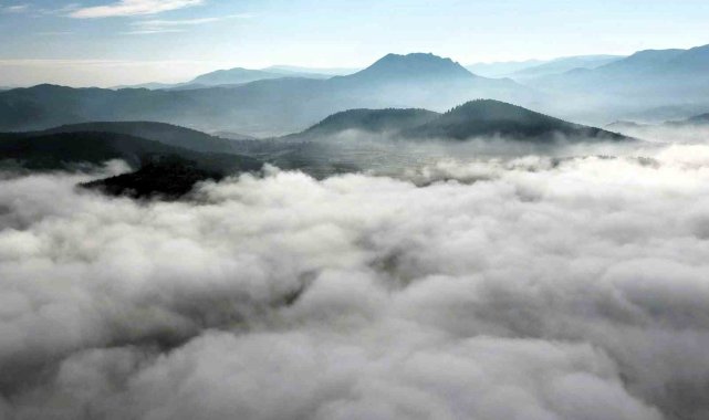 Sındırgı'nın simgelerinden olan Yağcıbedir halısı desenli kavşak adeta sis bulutlarının arasında kayboldu. İlçeyi kaplayan beyaz örtü, havadan görüntülendi. Görüntülerde, sis bulutu ile kaplanan şehir merkezinden kırsal bölgelere uzanan manzara görsel bir şölen oluşturdu.