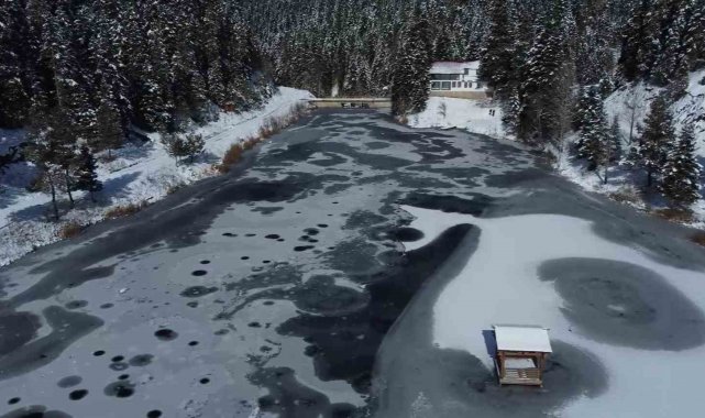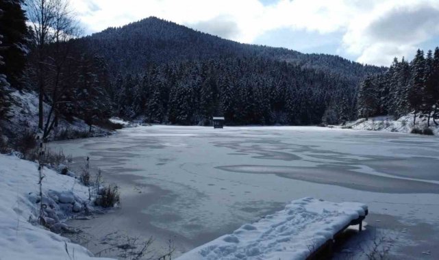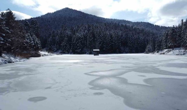 Sinop'un Ayancık ilçesinde Akgöl Tabiat Parkı'nda bulunan Akgöl'ün yüzeyi buzla kaplandı.